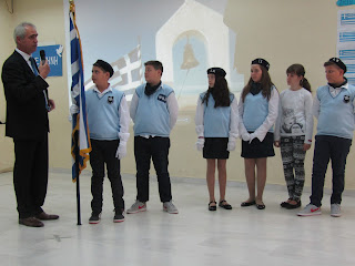 Κλείνοντας τη γιορτή ο Διευθυντής του σχολείου μας, κ. Δημήτρης Σιαμάγκας, παρέδωσε τη σημαία του σχολείου στο μαθητή της Έκτης τάξης και τους παραστάτες, που θα εκπροσωπήσουν το σχολείο στη μεγάλη παρέλαση της 28ης Οκτωβρίου στο κέντρο των Σερρών και ευχήθηκε να αξιωθούν κι άλλες τέτοιες στιγμές στη μαθητική ζωή τους.